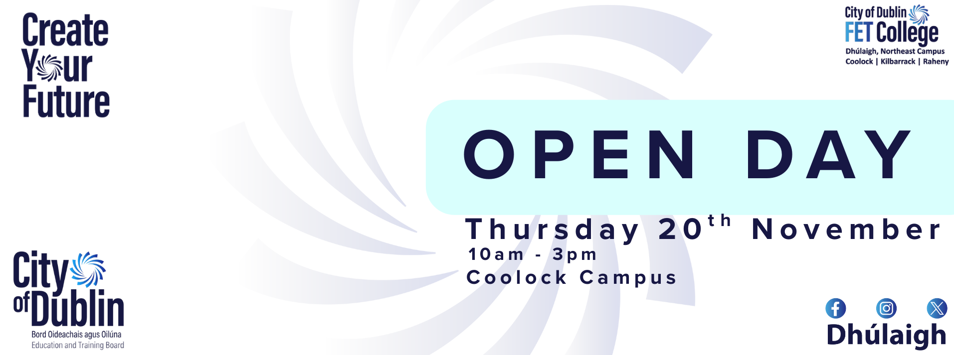 City of Dublin FET College, Dhúlaigh, Northeast Campus (formerly Coláiste Dhúlaigh) invites you to their Open Day on Thursday 20th…